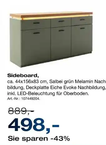 Sideboard ist jetzt im Angebot bei Möbel Inhofer, gültig vom 25-02-2026 bis 14-03-2026. Besuchen Sie die Website von Möbel Inhofer oder kaufen Sie Sideboard direkt im Geschäft. Auf Prospektangebote.de finden Sie immer die besten aktuellen Aktionen. Vergleichen Sie Sideboard mit anderen Angeboten und prüfen Sie, ob sich ein Kauf jetzt lohnt. Behalten Sie kommende Aktionen im Blick, denn manche Produkte sind nur nächste Woche oder nur vor Ort verfügbar.Häufig gestellte Fragen über Sideboard