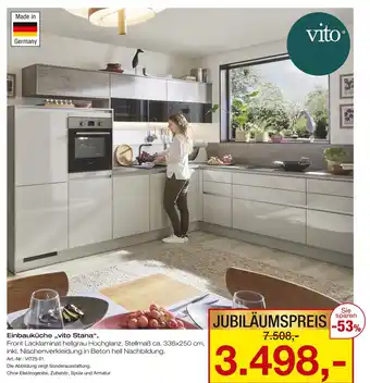 Vito einbauküche vito stana ist jetzt im Angebot bei Möbel Inhofer, gültig vom 08-01-2026 bis 31-01-2026. Besuchen Sie die Website von Möbel Inhofer oder kaufen Sie Vito einbauküche vito stana direkt im Geschäft. Auf Prospektangebote.de finden Sie immer die besten aktuellen Aktionen. Vergleichen Sie Vito einbauküche vito stana mit anderen Angeboten und prüfen Sie, ob sich ein Kauf jetzt lohnt. Behalten Sie kommende Aktionen im Blick, denn manche Produkte sind nur nächste Woche oder nur vor Ort verfügbar.Häufig gestellte Fragen über Vito einbauküche vito stana