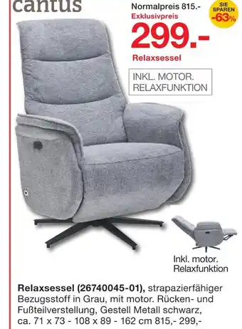 Cantus relaxsessel ist jetzt im Angebot bei Möbelzentrum Pforzheim, gültig vom 22-12-2025 bis 03-01-2026. Besuchen Sie die Website von Möbelzentrum Pforzheim oder kaufen Sie Cantus relaxsessel direkt im Geschäft. Auf Prospektangebote.de finden Sie immer die besten aktuellen Aktionen. Vergleichen Sie Cantus relaxsessel mit anderen Angeboten und prüfen Sie, ob sich ein Kauf jetzt lohnt. Behalten Sie kommende Aktionen im Blick, denn manche Produkte sind nur nächste Woche oder nur vor Ort verfügbar.Häufig gestellte Fragen über Cantus relaxsessel