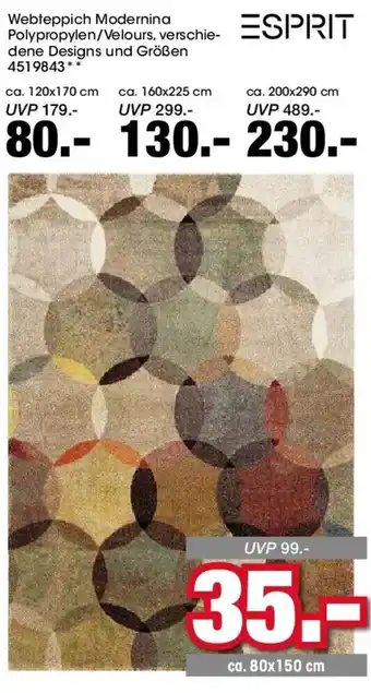 Den Preis von dem ESPRIT Webteppich Modernina finden Sie auch oben auf der Website, zusammen mit dem Datum, ab wann das Angebot erhältlich ist. Sie können die Preise auch im aktuellen Möbel Martin Prospekt nachhalten oder auf der Möbel Martin Website nachschauen. Durch die Angebote können Sie sicher sein, die Möbel Martin Produkte zum absoluten Bestpreis zu ergattern.