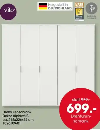 Vito Drehtürenschrank ist jetzt im Angebot bei Möbel Martin, gültig vom 01-03-2026 bis 31-03-2026. Besuchen Sie die Website von Möbel Martin oder kaufen Sie Vito Drehtürenschrank direkt im Geschäft. Auf Prospektangebote.de finden Sie immer die besten aktuellen Aktionen. Vergleichen Sie Vito Drehtürenschrank mit anderen Angeboten und prüfen Sie, ob sich ein Kauf jetzt lohnt. Behalten Sie kommende Aktionen im Blick, denn manche Produkte sind nur nächste Woche oder nur vor Ort verfügbar.Häufig gestellte Fragen über Vito Drehtürenschrank
