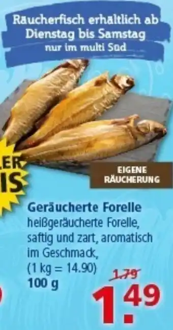 Den Preis von dem Geräucherte Forelle finden Sie auch oben auf der Website, zusammen mit dem Datum, ab wann das Angebot erhältlich ist. Sie können die Preise auch im aktuellen Multi Markt Prospekt nachhalten oder auf der Multi Markt Website nachschauen. Durch die Angebote können Sie sicher sein, die Multi Markt Produkte zum absoluten Bestpreis zu ergattern.