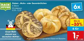 Jetzt im Angebot bei Netto Marken-Discount: BACK STUBE Kaiser-, Mohn- oder Sesambrötchen ✅ Aktion gültig vom 9-02 bis 14-02.