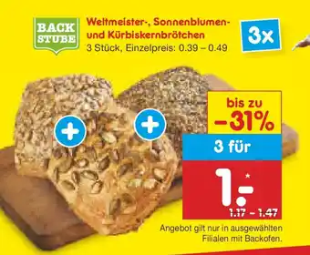 Jetzt im Angebot bei Netto Marken-Discount: BACK STUBE Weltmeister-, Sonnenblumen- und Kürbiskernbrötchen ✅ Aktion gültig vom 2-02 bis 7-02.