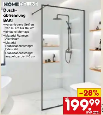 HOME DELUXE Duschabtrennung BAKI ist jetzt im Angebot bei Netto Marken-Discount, gültig vom 05-01-2026 bis 10-01-2026. Besuchen Sie die Website von Netto Marken-Discount oder kaufen Sie HOME DELUXE Duschabtrennung BAKI direkt im Geschäft. Auf Prospektangebote.de finden Sie immer die besten aktuellen Aktionen. Vergleichen Sie HOME DELUXE Duschabtrennung BAKI mit anderen Angeboten und prüfen Sie, ob sich ein Kauf jetzt lohnt. Behalten Sie kommende Aktionen im Blick, denn manche Produkte sind nur nächste Woche oder nur vor Ort verfügbar.Häufig gestellte Fragen über HOME DELUXE Duschabtrennung BAKI