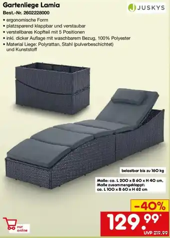 JUSKYS Gartenliege Lamia ist jetzt im Angebot bei Netto Marken-Discount, gültig vom 01-03-2026 bis 31-03-2026. Besuchen Sie die Website von Netto Marken-Discount oder kaufen Sie JUSKYS Gartenliege Lamia direkt im Geschäft. Auf Prospektangebote.de finden Sie immer die besten aktuellen Aktionen. Vergleichen Sie JUSKYS Gartenliege Lamia mit anderen Angeboten und prüfen Sie, ob sich ein Kauf jetzt lohnt. Behalten Sie kommende Aktionen im Blick, denn manche Produkte sind nur nächste Woche oder nur vor Ort verfügbar.Häufig gestellte Fragen über JUSKYS Gartenliege Lamia