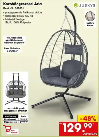 Den Preis von dem JUSKYS Korbhängesessel Aria finden Sie auch oben auf der Website, zusammen mit dem Datum, ab wann das Angebot erhältlich ist. Sie können die Preise auch im aktuellen Netto Marken-Discount Prospekt nachhalten oder auf der Netto Marken-Discount Website nachschauen. Durch die Angebote können Sie sicher sein, die Netto Marken-Discount Produkte zum absoluten Bestpreis zu ergattern.