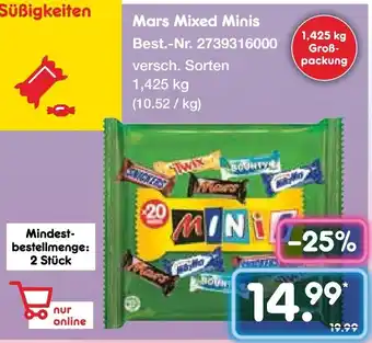 Abgesehen von Mars Mixed Minis, bietet Netto Marken-Discount eine Menge anderer Artikel an. Behalten Sie den wöchentlichen Netto Marken-Discount Prospekt im Blick, um die besten Angebote und Aktionen nicht zu verpassen. Abgesehen von Mars Mixed Minis können Sie weitere, interessante Angebote entdecken: MARS Minis, Mars Riegel Minis & Bounty, mars, milky way, snickers, twix minis.