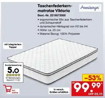 Jetzt im Angebot bei Netto Marken-Discount: Taschenfederkernmatratze Viktoria ✅ Aktion gültig vom 30-12 bis 31-01.