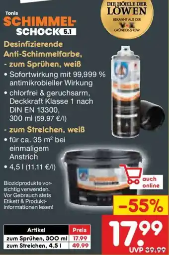 Jetzt im Angebot bei Netto Marken-Discount: Tonis SCHIMMELSCHOCK 5.1 Desinfizierende Anti-Schimmelfarbe, - zum Sprühen, weiß ✅ Aktion gültig vom 2-03 bis 7-03.