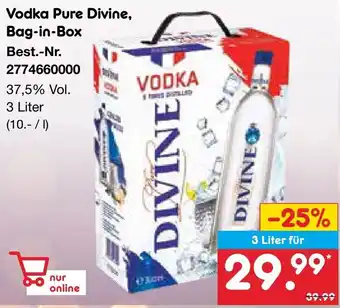 Jetzt im Angebot bei Netto Marken-Discount: Vodka Pure Divine, Bag-in-Box ✅ Aktion gültig vom 1-03 bis 31-03.