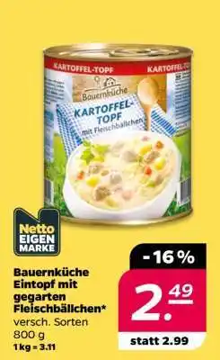 Jetzt im Angebot bei NETTO: Bauernküche Eintopf mit gegarten Fleischbällchen ✅ Aktion gültig vom 12-01 bis 17-01.