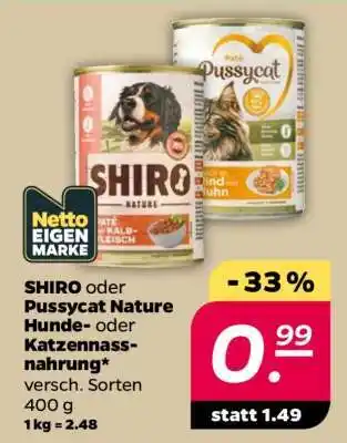 Jetzt im Angebot bei NETTO: SHIRO oder Pussycat Nature Hundefutter oder Katzennassnahrung ✅ Aktion gültig vom 13-04 bis 18-04.