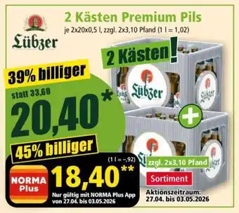 Jetzt im Angebot bei Norma: 2 Kästen Premium Pils ✅ Aktion gültig vom 27-04 bis 3-05.