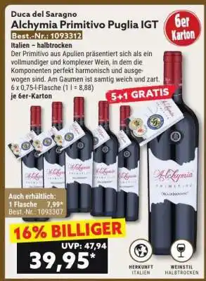 Abgesehen von Alchymia Primitivo Puglia IGT, bietet Norma eine Menge anderer Artikel an. Behalten Sie den wöchentlichen Norma Prospekt im Blick, um die besten Angebote und Aktionen nicht zu verpassen. Abgesehen von Alchymia Primitivo Puglia IGT können Sie weitere, interessante Angebote entdecken: Primitivo Puglia IGT, Novantaceppi primitivo puglia & Primitivo Susumaniello Salento IGT.