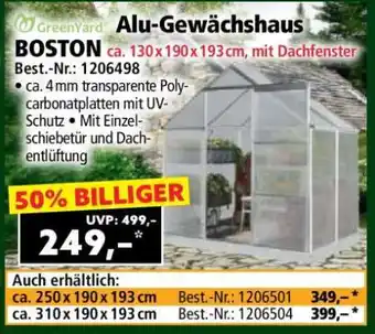 Jetzt im Angebot bei Norma: Alu-Gewächshaus BOSTON ca. 130 x 190 x 193 cm, mit Dachfenster ✅ Aktion gültig vom 26-01 bis 1-02.