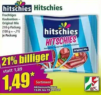 Den Preis von dem Hitschies finden Sie auch oben auf der Website, zusammen mit dem Datum, ab wann das Angebot erhältlich ist. Sie können die Preise auch im aktuellen Norma Prospekt nachhalten oder auf der Norma Website nachschauen. Durch die Angebote können Sie sicher sein, die Norma Produkte zum absoluten Bestpreis zu ergattern.
