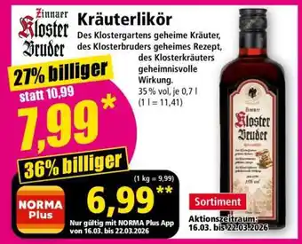 Jetzt im Angebot bei Norma: Zinnaer Kloster Bruder Kräuterlikör ✅ Aktion gültig vom 16-03 bis 22-03.