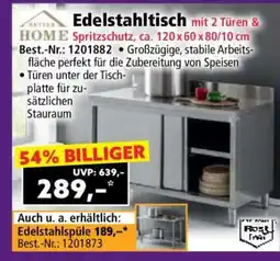 Edelstahltisch mit 2 Türen & Spritzschutz, ca. 120 x 60 x 80/10 cm