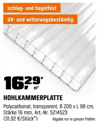 Polycarbonat, transparent, B 200 x L 98 cm. Stärke 16 mm, Art.-Nr. 5214523 (31,92 €/Stück*) Abgabe nur in ganzen Platten.
