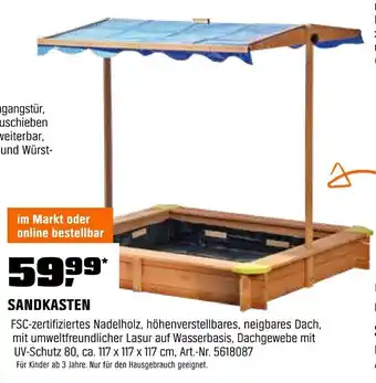 Abgesehen von SANDKASTEN, bietet OBI eine Menge anderer Artikel an. Behalten Sie den wöchentlichen OBI Prospekt im Blick, um die besten Angebote und Aktionen nicht zu verpassen. Abgesehen von SANDKASTEN können Sie weitere, interessante Angebote entdecken: Sandkasten, Sandkasten & Sandkasten 'Schiff', Kinder-Outdoor-Sandkasten aus wetterfestem Massivholz, inkl. Sonnendach.