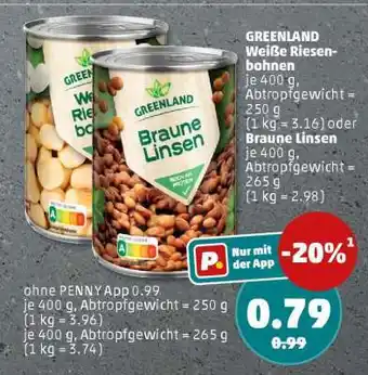 Jetzt im Angebot bei PENNY: GREENLAND Weiße Riesenbohnen oder Braune Linsen ✅ Aktion gültig vom 12-01 bis 17-01.