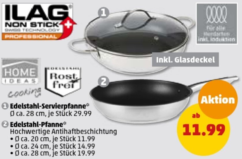 Den Preis von dem HOME IDEAS cooking Edelstahl-Servierpfanne finden Sie auch oben auf der Website, zusammen mit dem Datum, ab wann das Angebot erhältlich ist. Sie können die Preise auch im aktuellen PENNY Prospekt nachhalten oder auf der PENNY Website nachschauen. Durch die Angebote können Sie sicher sein, die PENNY Produkte zum absoluten Bestpreis zu ergattern.