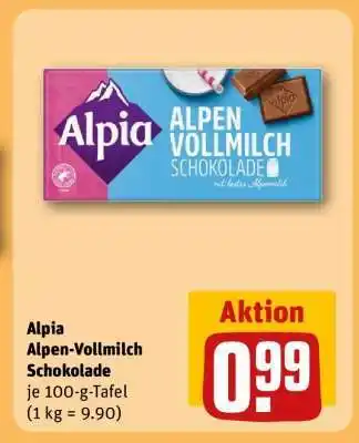 Jetzt im Angebot bei REWE: Alpia Alpen Vollmilch Schokolade ✅ Aktion gültig vom 18-01 bis 25-01.
