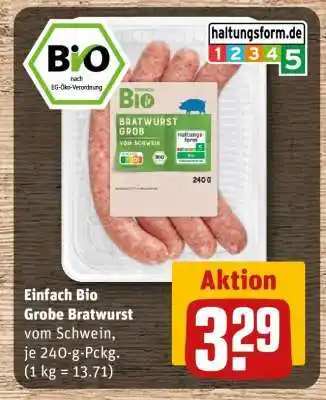 Jetzt im Angebot bei REWE: Einfach Bio Grobe Bratwurst ✅ Aktion gültig vom 16-02 bis 22-02.