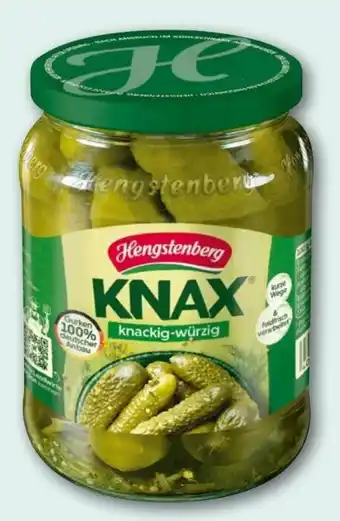 Jetzt im Angebot bei REWE: Hengstenberg Knax Gewürzgurken knackig-würzig ✅ Aktion gültig vom 19-01 bis 25-01.