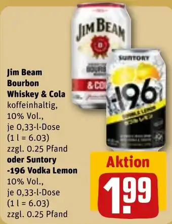 Jetzt im Angebot bei REWE: Jim Beam Bourbon Whiskey & Cola oder Suntory -196 Vodka Lemon ✅ Aktion gültig vom 27-04 bis 3-05.