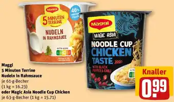Maggi 5 Minuten Terrine Nudeln in Rahmsauce oder Magic Asia Noodle Cup Chicken Aktion bei REWE