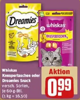 Whiskas Knuspertaschen oder Dreamies Snack Aktion bei REWE