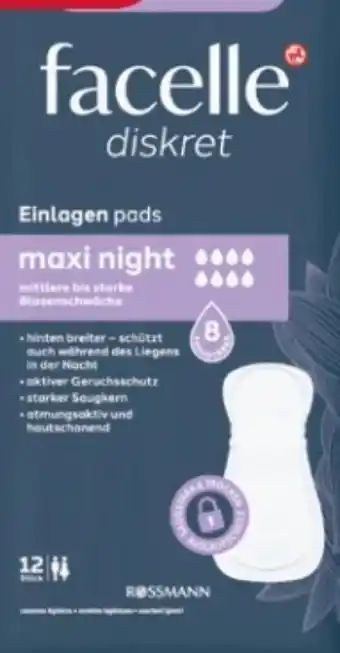 Jetzt im Angebot bei Rossmann: Facelle Diskret Hygiene-Einlagen Maxi Night ✅ Aktion gültig vom 23-02 bis 28-02.