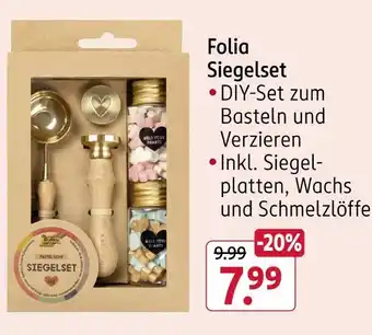 Abgesehen von Folia siegelset, bietet Rossmann eine Menge anderer Artikel an. Behalten Sie den wöchentlichen Rossmann Prospekt im Blick, um die besten Angebote und Aktionen nicht zu verpassen. Abgesehen von Folia siegelset können Sie weitere, interessante Angebote entdecken: Folia strickliesel, Folia mini filzinies & Folia diy legekarten.