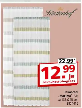 Den Preis von dem Fürstenhof dekoschal 'maxima' finden Sie auch oben auf der Website, zusammen mit dem Datum, ab wann das Angebot erhältlich ist. Sie können die Preise auch im aktuellen Segmüller Prospekt nachhalten oder auf der Segmüller Website nachschauen. Durch die Angebote können Sie sicher sein, die Segmüller Produkte zum absoluten Bestpreis zu ergattern.