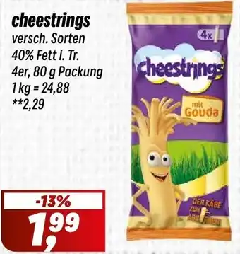 cheestrings ist jetzt im Angebot bei Simmel, gültig vom 20-04-2026 bis 25-04-2026. Besuchen Sie die Website von Simmel oder kaufen Sie cheestrings direkt im Geschäft. Auf Prospektangebote.de finden Sie immer die besten aktuellen Aktionen. Vergleichen Sie cheestrings mit anderen Angeboten und prüfen Sie, ob sich ein Kauf jetzt lohnt. Behalten Sie kommende Aktionen im Blick, denn manche Produkte sind nur nächste Woche oder nur vor Ort verfügbar.Häufig gestellte Fragen über cheestrings