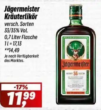 Diese Woche ist Jägermeister Kräuterlikör bei Simmel reduziert erhältlich. Hier finden Sie alle Informationen zu Preisen, Aktionsdetails und Laufzeit. Prüfen Sie weitere Jägermeister Kräuterlikör Aktionen, um sicherzugehen, dass Sie den besten Preis erhalten. Die Jägermeister Kräuterlikör Aktion gilt in Kalenderwoche 12. Nach Ablauf zeigen wir Ihnen vergleichbare Alternativen. Abonnieren Sie die Kategorie, um beim nächsten Mal direkt informiert zu sein, wenn Jägermeister Kräuterlikör wieder reduziert ist.Häufig gestellte Fragen über Jägermeister Kräuterlikör