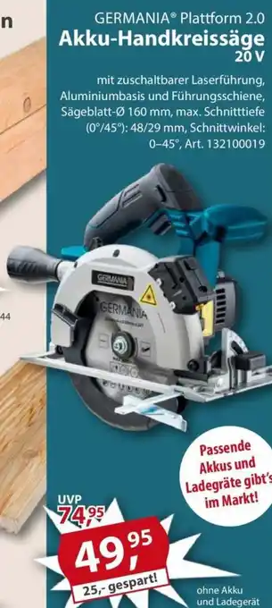GERMANIA Plattform 2.0 Akku-Handkreissäge 20V Angebote und Online Aktionen direkt aus dem aktuellen Sonderpreis Baumarkt Angebot