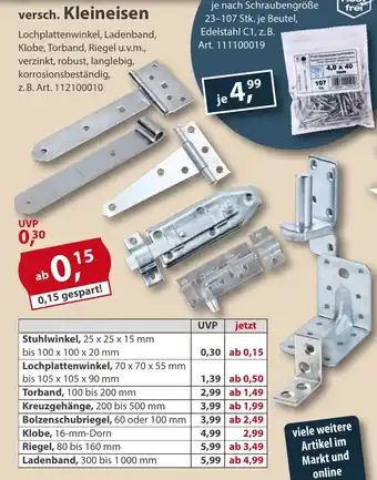 Abgesehen von versch. Kleineisen, bietet Sonderpreis Baumarkt eine Menge anderer Artikel an. Behalten Sie den wöchentlichen Sonderpreis Baumarkt Prospekt im Blick, um die besten Angebote und Aktionen nicht zu verpassen. Abgesehen von versch. Kleineisen können Sie weitere, interessante Angebote entdecken: versch. Reifenfüller, versch. Gartengeräte & versch. Balkenschuhe.