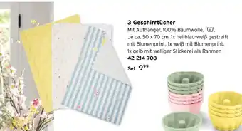 Mit Aufhänger. 100% Baumwolle. Je ca. 50 x 70 cm. 1x hellblau-weiß gestreift mit Blumenprint, 1x weiß mit Blumenprint, 1x gelb mit welliger Stickerei als Rahmen 42 214 708