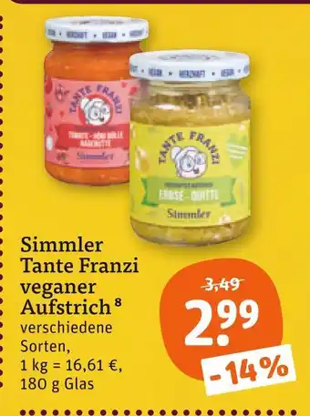Jetzt im Angebot bei tegut: Simmler tante franzi veganer aufstrich ✅ Aktion gültig vom 12-01 bis 17-01.