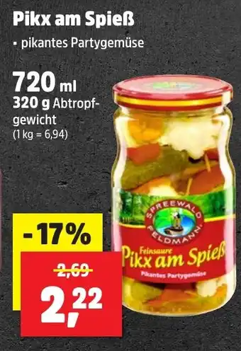 Das Angebot ist in verschiedenen Geschäften erhältlich. Schauen Sie sich alle Produkte an, um das günstigste Pikx am Spieß zu ergattern. Wenn Sie gerne nachschauen möchten, ob der Artikel woanders noch günstiger ist, werfen Sie einen Blick auf die Kategorie 'Garten und Tiere'. Möglicherweise sind diese Angebote auch interessant für Sie: Spreewald feldmann pikx am spieß, Spreewald-Feldmann Feinsaure Pikx am Spieß & Rewe Rindfleisch-Spieß.
