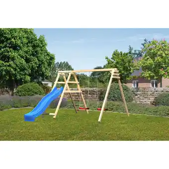 Jetzt im Angebot bei toom Baumarkt: Akubi Doppelschaukel 'Felix' Rutsche blau, Klettergerüst, 308 x 213 cm ✅ Aktion gültig vom 1-03 bis 7-03.