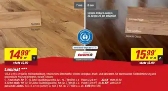 Den Preis von dem Laminat finden Sie auch oben auf der Website, zusammen mit dem Datum, ab wann das Angebot erhältlich ist. Sie können die Preise auch im aktuellen Toom Baumarkt Prospekt nachhalten oder auf der toom Baumarkt Website nachschauen. Durch die Angebote können Sie sicher sein, die toom Baumarkt Produkte zum absoluten Bestpreis zu ergattern.