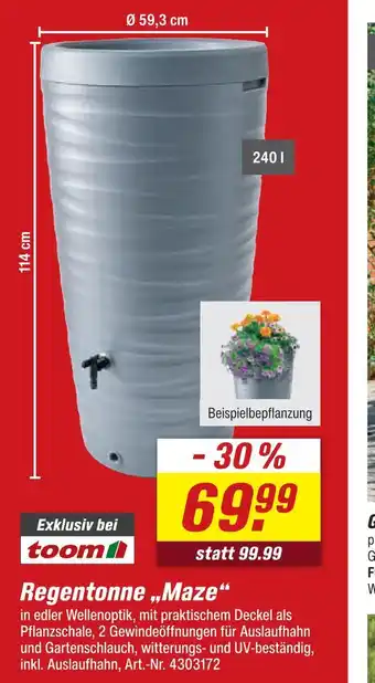 Abgesehen von Regentonne, bietet toom Baumarkt eine Menge anderer Artikel an. Behalten Sie den wöchentlichen Toom Baumarkt Prospekt im Blick, um die besten Angebote und Aktionen nicht zu verpassen. Abgesehen von Regentonne können Sie weitere, interessante Angebote entdecken: Regentonne maze, Regentonne >>Maze<< & Regentonne ,,Maze“.