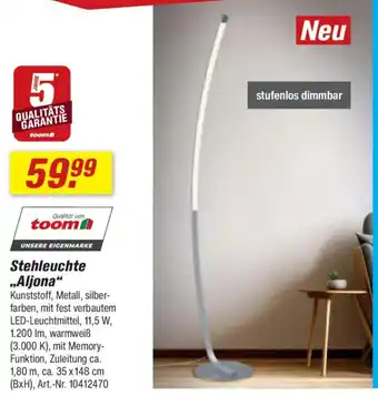 Den Preis von dem Stehleuchte ,,Aljona“ finden Sie auch oben auf der Website, zusammen mit dem Datum, ab wann das Angebot erhältlich ist. Sie können die Preise auch im aktuellen Toom Baumarkt Prospekt nachhalten oder auf der toom Baumarkt Website nachschauen. Durch die Angebote können Sie sicher sein, die toom Baumarkt Produkte zum absoluten Bestpreis zu ergattern.