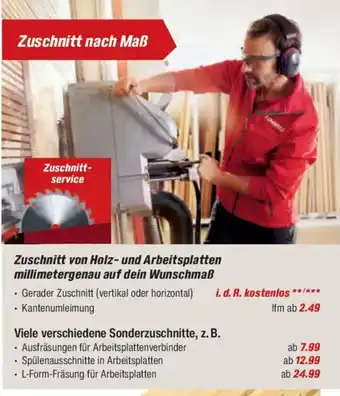 Zuschnitt von Holz- und Arbeitsplatten millimetergenau auf dein Wunschmaẞ ⚫ Gerader Zuschnitt (vertikal oder horizontal) Kantenumleimung i.d.R. kostenlos **/*** Ifm ab 2.49 Viele verschiedene Sonderzuschnitte, z. B. Ausfräsungen für Arbeitsplattenverbinder Spülenausschnitte in Arbeitsplatten