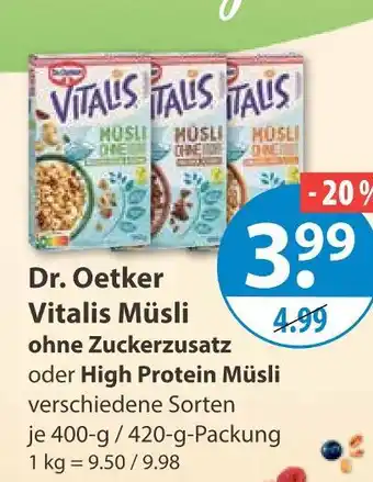 Dr. oetker vitalis müsli ohne zuckerzusatz oder high protein müsli Aktion bei V Markt