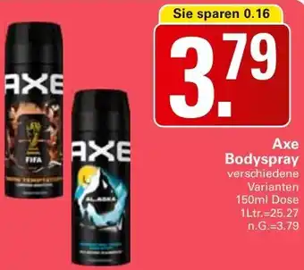 Den Preis von dem Axe Bodyspray finden Sie auch oben auf der Website, zusammen mit dem Datum, ab wann das Angebot erhältlich ist. Sie können die Preise auch im aktuellen WEZ Prospekt nachhalten oder auf der WEZ Website nachschauen. Durch die Angebote können Sie sicher sein, die WEZ Produkte zum absoluten Bestpreis zu ergattern.